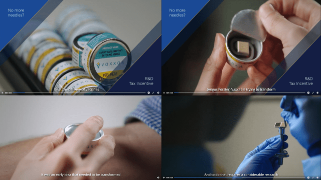 La tecnología Nanopatch de Vaxxas permite la vacunación mediante la aplicación breve de un pequeño parche en la piel, lo que ofrece una alternativa más segura, indolora y fácil de usar a la inyección con aguja. El incentivo fiscal de I + D ayudó a Vaxxas a realizar una amplia I + D para probar el producto y generar datos para respaldar la inversión privada y ensayos clínicos más amplios.