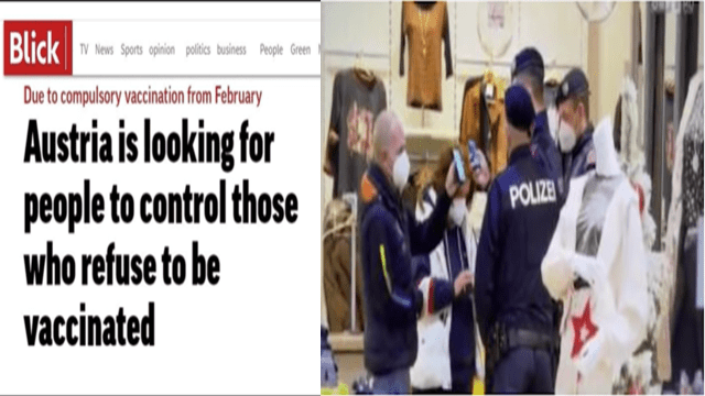 Si nos hubieran dicho veinte años atrás lo que estamos viviendo ahora, le hubiésemos dicho a la persona que nos lo está contando ¡¡Te has vuelto loco!! Pero no, el gobierno austriaco está contratando personal (cazadores de vacunas) para localizar a todo aquel austriaco que no esté vacunado. Por ley a partir de febrero 2022 el gobierno austriaco mandará a estos cazadores de no vacunados para localizarles, y, cuando los hayan localizado, no solo se les va a forzar a vacunarse, sino que serán multados con 3.600 euros; cualquiera que no quiera vacunarse en Austria a partir de 2022 deberá pagar esta multa y lo que se les vaya ocurriendo.
