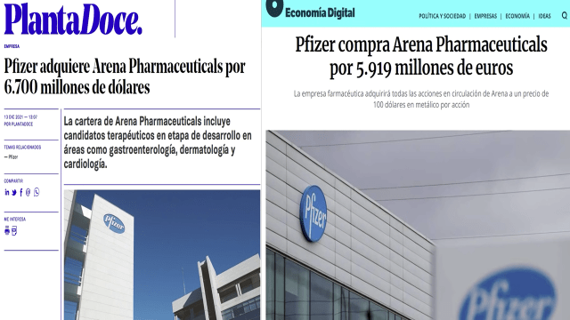 Por lo pronto, el laboratorio estadounidense Pfizer ha llegado a un acuerdo definitivo para adquirir por 6.700 millones de dólares la farmacéutica “Arena Pharmaceuticals”, como anunciaron ambas empresas. Es evidente que la compañía Pfizer que está dejando todo para luchar ante esta situación de “pandemia” por la que está atravesando la humanidad, por este motivo compra la farmacéutica Arena, que hay que recalcar que es una farmacéutica especializada en enfermedades inmunoinflamatorias y cardiacas.