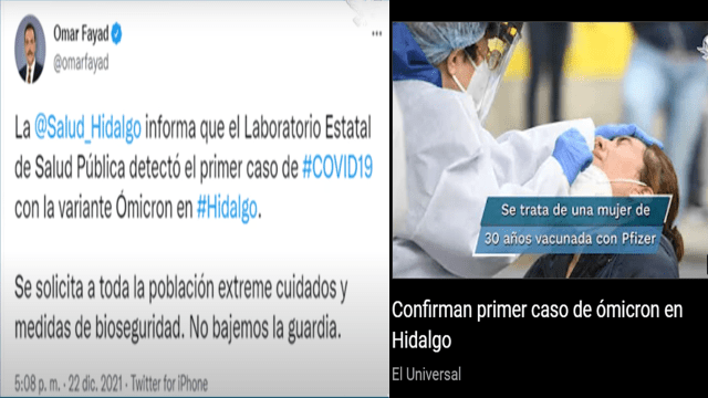La agencia masónica, digo mexicana de noticias, el universal, Omar Fayad gobernador del estado de Hidalgo y Alejandro Efraín Benítez, secretario de Salud, informaron de UN CONTAGIO en el estado, señalaron que se trata de una mujer de 30 años de edad, la cual tiene antecedente de viaje a Italia y Londres, además de que contaba con el esquema completo de vacunación con el biológico de Pfizer.