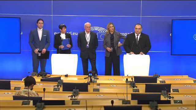 Bruselas, Parlamento Europeo – conferencia de prensa del 8 de diciembre de 2021. El eurodiputado Cristian Terhes, junto con otros 4 eurodiputados, responde a la intención de Ursula von der Leyen de iniciar el debate sobre la vacunación obligatoria.