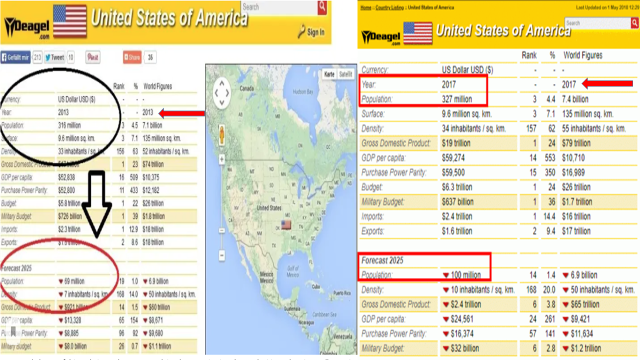 Ellos pronostican en 2013 que la población de los EE.UU, que se mantenía en 316 millones, será para 2025 de 69 millones; en 2017, la población de los EE.UU se reduciría a menos de 1/3, a 100 millones; mientras que en el Reino Unido se reduce a menos de 1/6 su población según lo pronosticado en el 2017 de 66 millones a 15 millones; así también Francia perdería casi la mitad de su población mientras que la población de Alemania se reducirá para ellos inexplicablemente de 81 millones a 28 millones.