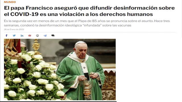 Y para terminar, no podía faltar nombrar a francisquito Pseudoprofeta, quien hace unos días afirmó que: “la difusión de noticias falsas y desinformación sobre el COVID-19 y las vacunas, incluso por parte de los medios de comunicación católicos, es una violación de los derechos humanos”.