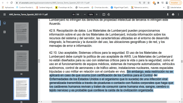 Ya que entraste a términos y servicios de AWS, escoges el idioma y después bajas hasta el punto 42.10, hay que bajar y bajar, porque esta gente escribe más que un periódico, pero como sabe que la gente no lo lee, sabe que aquí nadie lee nada, así nos cuelan todo, llegamos al punto 42.10, lo podemos leer en la captura de pantalla más abajo.