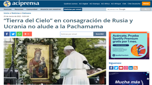 Se leyó por allí: Este 25 de marzo el Papa Francisco consagrará a Rusia y Ucrania al Inmaculado Corazón de María con una oración que tiene entre sus frases la expresión “Tú, ‘tierra del Cielo’, vuelve a traer la armonía de Dios al mundo”, y que ha sido considerada por algunos comentaristas católicos como una alusión a la Pachamama (madre tierra en quechua). La Pachamama, deidad prehispánica de Sudamérica, fue motivo de controversia durante el Sínodo de la Amazonía realizado en el Vaticano en octubre de 2019, y ha vuelto a ser tema en redes sociales a raíz de la oración de consagración que recitará este viernes el Papa. Sin embargo, en un artículo publicado el 23 de marzo por Vatican News, el director editorial del Dicasterio para la Comunicación, Andrea Tornielli, explicó extractos de la oración, entre estos “tierra del Cielo”: “Tú, ‘tierra del Cielo’, vuelve a traer la armonía de Dios al mundo”, dice la oración. “La expresión ‘tierra del cielo’ –explicó Tornielli– está tomada de un himno monástico bizantino-eslavo, y significa poéticamente la unión del cielo y la tierra que podemos contemplar en María asunta al cielo con su cuerpo”. (texto de Aciprensa).