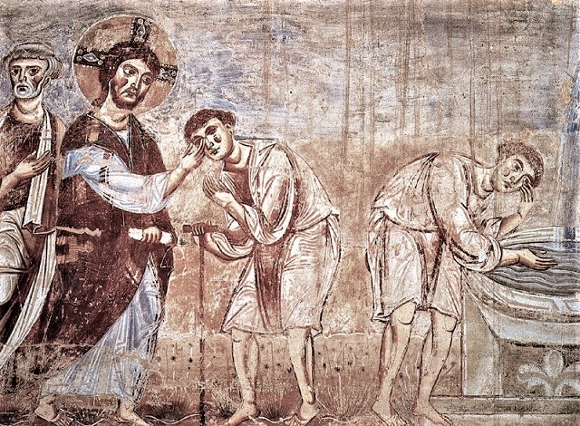 Vino el Señor; ¿qué hizo? Ha hecho valer un gran misterio. Escupió en tierra, de su saliva hizo barro porque el Verbo se hizo carne, y untó los ojos del ciego. Estaba untado, mas no veía aún. Lo envió a la piscina que se llama Siloé.