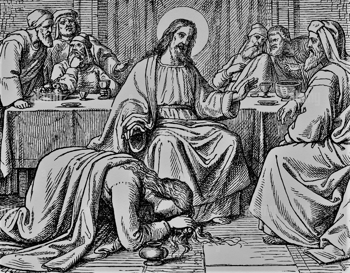 Uno de los fariseos le rogó que fuese a comer con Él, y habiendo entrado Jesús en la casa del fariseo, se puso a la mesa. Entonces una mujer de la ciudad, que era pecadora, al saber que Jesús se encontraba reclinado a la mesa en casa del fariseo, tomó consigo un vaso de alabastro, con ungüento; y colocándose detrás de Él, a sus pies y llorando, con sus lágrimas bañaba sus pies y los enjugaba con su cabellera; los llenaba de besos y los ungía con el ungüento. Viendo lo cual el fariseo que lo había convidado dijo para sus adentros: “Si éste fuera profeta, ya sabría quién y de qué clase es la mujer que lo está tocando, que es una pecadora”. Entonces Jesús respondiendo a sus pensamientos le dijo: “Simón, tengo algo que decirte”. Y él: “Dilo, Maestro”. Y dijo: “Un acreedor tenía dos deudores: el uno le debía quinientos denarios, el otro cincuenta. Como no tuviesen con qué pagar, les perdonó a los dos. ¿Cuál de ellos lo amará más?” Simón respondió diciendo: “Supongo que aquel a quien más ha perdonado”. Él le dijo: “Bien juzgaste”. Y volviéndose hacia la mujer, dijo a Simón: “¿Ves a esta mujer? Vine a tu casa, y tú no vertiste agua sobre mis pies; mas ésta ha regado mis pies con sus lágrimas y los ha enjugado con sus cabellos. Tú no me diste el ósculo; mas ella, desde que entró, no ha cesado de besar mis pies. Tú no ungiste con óleo mi cabeza; ella ha ungido mis pies con ungüento. Por lo cual te digo, se le han perdonado sus pecados, los muchos, puesto que ha amado mucho. A la inversa, aquel a quien se perdone poco, ama poco”. Después dijo a ella: “Tus pecados se te han perdonado”. Entonces, los que estaban con Él a la mesa se pusieron a decir entre sí: “¿Quién es Éste, que también perdona pecados?” Y dijo a la mujer: “Tu fe te ha salvado: vete en paz”.