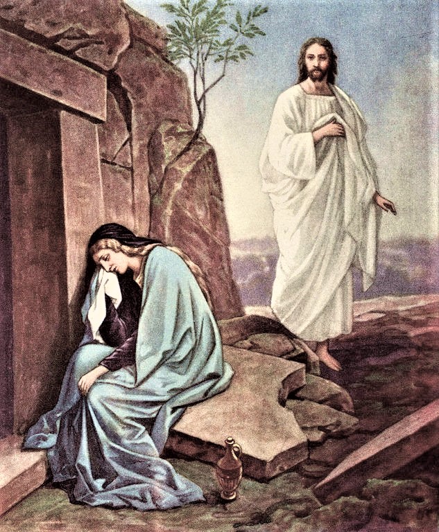 María estaba fuera, llorando junto al sepulcro. Y estando así llorando, se abajó, y miró hacia el sepulcro: y vio dos Ángeles vestidos de blanco, sentados; el uno a la cabecera y el otro a los pies, en donde había sido puesto el cuerpo de Jesús. Y le dijeron: «¿Mujer, por qué lloras?» Díceles: «Porque se han llevado de aquí a mi Señor, y no sé dónde le han puesto». Y cuando esto hubo dicho, se volvió a mirar atrás, y vio a Jesús que estaba en pie; mas no sabía que era Jesús. Jesús le dice: «¿Mujer, por qué lloras? ¿a quién buscas?» Ella, creyendo que era el hortelano, le dijo: «Señor, si tú le has llevado de aquí, dime en dónde lo has puesto, y yo le llevaré». Jesús le dice: «María». Vuelta ella, le dice: «Rabboni» (que quiere decir Maestro). Jesús le dice: «No me toques, porque aún no he subido a mi Padre; mas ve a mis hermanos y diles: Subo a mi Padre y vuestro Padre, a mi Dios y vuestro Dios». Vino María Magdalena dando las nuevas a los discípulos: «Que he visto al Señor, y esto me ha dicho».