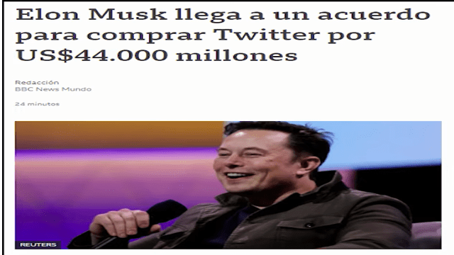 Pero, ¿quién es Elon Musk? ¿El expropiador de proyectos? Sí. Actualmente Elon Musk está en boca de todos, ¿será porque el gobierno mundial quiere utilizarlo como instrumento?, o ¿será porque realmente él quiere hacer, lo que dice que quiere hacer, recuperar la libertad tomando el control total de tiwter, para devolver la libertad de expresión a Estados Unidos y al mundo entero?