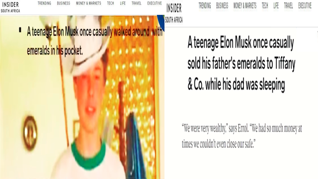 Elon Musk nació en Sudáfrica, y asegura que nació extremadamente pobre, pero su familia poseía una mina de esmeraldas. En su adolescencia, Elon comercializaría esmeraldas por dinero en efectivo en la Ciudad de New York.