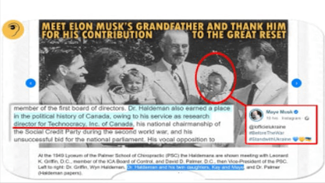 Joshua Haldemman…, da la casualidad que este hombre es el padre de Maye Musk que, a su vez es la madre de Elon Musk, es decir, que este señor Joshua Haldemman es el abuelo de Elon Musk… Pues bien, Haldemman fue el director de investigación y líder del partido de la rama canadiense de la tecnocracia.