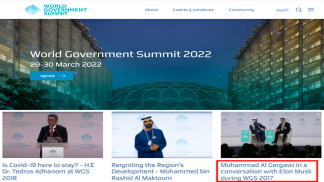 Durante la quinta edición de la WGS en 2017, el Ministro de Asuntos del Gabinete de los Emiratos Árabes Unidos y Presidente de la Cumbre Mundial de Gobiernos (WGS), Mohammad Al Gergawi, en una conversación con Elon Musk, CEO de Tesla y SpaceX, trataron el tema de La Renta Básica Universal, esta herramienta está en los fundamentos del NWO, tanto así que la trajeron a colación en esta cumbre de 2022.