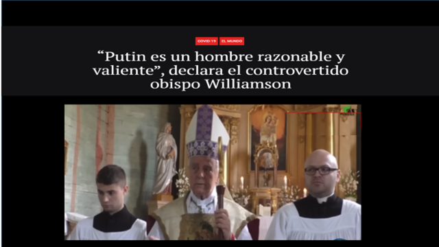 El obispo de Kent dijo que el presidente ruso “no es un ángel ni un santo, pero, sin embargo, es un hombre razonable y valiente”. El objetivo de Vladimir Putin, según Williamson, es la desnazificación y desmilitarización de Ucrania, pero “la estúpida Europa que sigue a Estados Unidos quiere destruir a Rusia” (no se da cuenta de que Rusia más tarde que temprano invadirá no nada más Ucrania sino toda Europa) y la guerra podría volverse aún más dura” dijo.