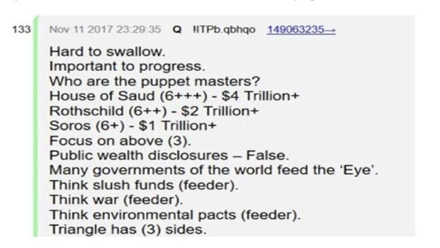 Según Q Anon, debemos seguir el rastro del dinero para comenzar a obtener respuestas a estas preguntas. En una publicación del 11 de noviembre de 2017, Q Anon en su sitio declaró: