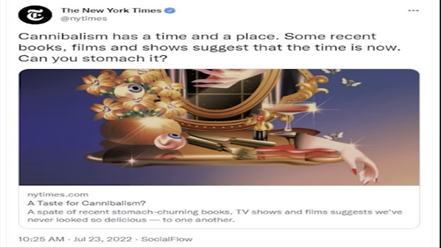 Esto es lo que ellos han posteado en el pajarito azul: “el canibalismo tiene un tiempo y un lugar, algunos libros, películas y programas recientes sugieren que ahora es el momento. ¿Puedes soportarlo?”