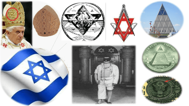 Este no es el Dios de la Biblia, sino el que aparece en el dólar, en Kazaj-satán y en la bandera Israelita. Esto significa el dios de las religiones babilónicas, que es Lucifer, como dice el Profeta, “la estrella de vuestro dios, que os habíais fabricado” (la estrella de Renfán).