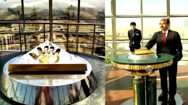 Por ejemplo, la huella de la mano (¿?) de uno de los “presidentes” en un altar en forma de triángulo, y a su lado un planeta en miniatura firmado por 17 líderes de religiones diferentes, como si estuvieran unificados.