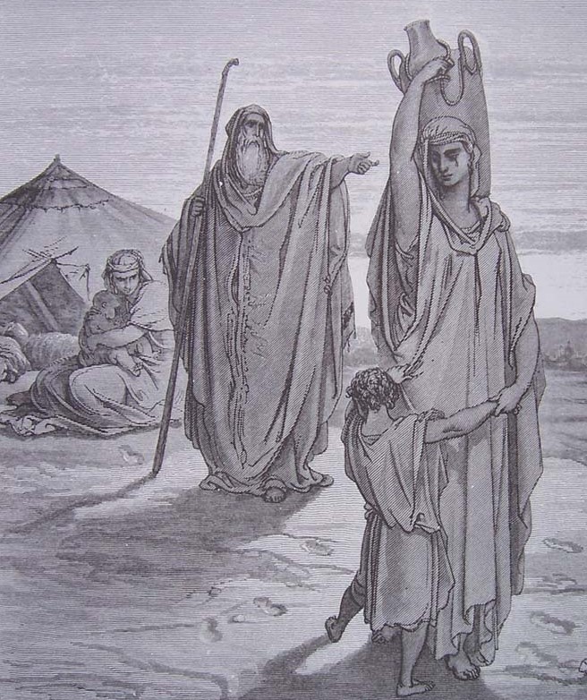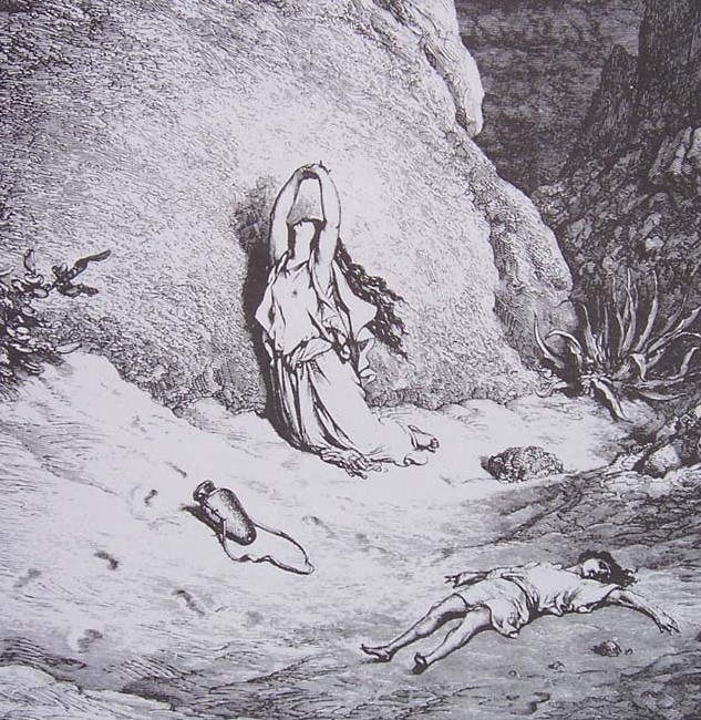 Gén. XXI, 9-20: Mas cuando Sara vio que el hijo que Abrahán había recibido de Agar la egipcia, se burlaba, dijo a Abrahán: “Echa fuera a esta esclava y a su hijo; porque el hijo de esta esclava no ha de ser heredero con mi hijo Isaac.” Esta palabra parecía muy dura a Abrahán, por cuanto se trataba de su hijo. Pero Dios dijo a Abrahán: “No te aflijas por el niño y por tu esclava. En todo lo que dijere Sara, oye su voz; pues por Isaac será llamada tu descendencia. Mas también del hijo de la esclava haré una nación, por ser descendiente tuyo.” Se levantó, pues, Abrahán muy de mañana, tomó pan y un odre de agua, y se lo dio a Agar, poniéndolo sobre el hombro de ésta; le entregó también el niño, y la despidió. La cual se fue y anduvo errante por el desierto de Bersabee. Cuando se acabó el agua del odre, echó ella al niño bajo uno de los arbustos, y fue a sentarse frente a él, a la distancia de un tiro de arco; porque decía: “No quiero ver morir al niño.” Sentada, pues, en frente, alzó su voz y prorrumpió en lágrimas. Mas Dios oyó la voz del niño; y el Ángel de Dios llamó a Agar desde el cielo, y le dijo: “¿Qué te pasa, Agar? No temas, porque Dios ha oído la voz del niño en el lugar donde está. Levántate, alza al niño, y tómalo de la mano, porque haré de él un gran pueblo.” Y le abrió Dios los ojos, y ella vio un pozo de agua; fue y llenó el odre de agua, y dio de beber al niño. Y Dios asistió al niño, el cual creció y habitó en el desierto, y vino a ser tirador de arco.
