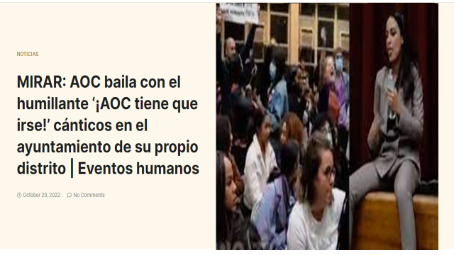 Pues, nuestra querida Alexandra Ocasio Cortés en estos momentos no lo está pasando nada bien. Ahora acaba de ser interrumpida por su propia gente, le vociferaban desde lejos y de muy cerca de ella, “AOC tienes que irte ya”. La representante socialista demócrata Alexandra Ocasio Cortés demócrata por Nueva York ha probado de su propia medicina este pasado miércoles 19 octubre por la noche cuando los manifestantes de su propio partido la interrumpieron en una reunión del ayuntamiento local con los electores en Queens, Nueva York, con alguna diferencia de lo que le ocurrió en un ayuntamiento la semana pasada en el Bronx donde AOC fue interrumpida por manifestantes contra lo que está sucediendo entre Rusia y Ucrania.