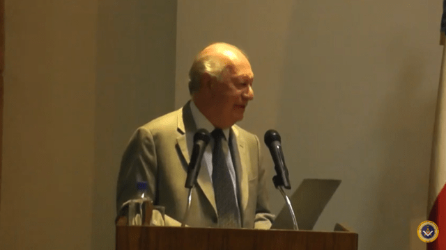 “En primer lugar agradecemos esta desafiante invitación, en donde lo que está planteado es un signo para pensar, así, dios, donde hagas tenemos la sensación que nos hace falta el poder tener una mirada un poco más grande un poco más allá de lo que es la contingencia cotidiana y en ese sentido creo que esta institución, que está entrocada con la tradición de Chile, esta institución a la cual Chile y sus instituciones le deben tanto, es tal vez un lugar más que adecuado para seguir pensando así, las posibilidades de abrirse a distintas miradas del espíritu, la posibilidad de entender que mi verdad termina donde empieza tu verdad, la posibilidad de la tolerancia que aquí se ha practicado es lo que hace falta para llevar a Chile hacia adelante y por eso creo estimado amigo, Gran Maestre, que este ciclo que inicia, Gran Maestre, lo Inicia con la epispi y la espada que le da Ser el gran maestre de la masonería que ha pensado en Chile siempre en el largo plazo y hacia adelante”
