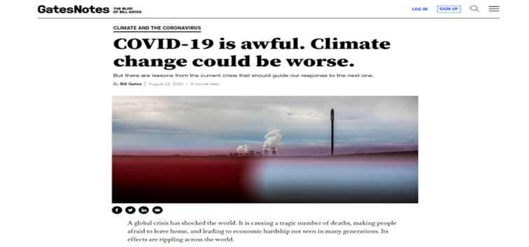 ¿Qué ha sucedido? Bill Gates publicó un artículo (noten que es una página web oficial de las notas personales del Gato Vil); allí dice que la reducción del 8% de emisiones durante el 2020, durante los encierros, fue algo positivo; pero que no fue suficiente para contrastar los efectos del clima. Admite que esto le costó mucho trabajo a la humanidad, e incluso mucho más dinero del que se esperaba; pero también añade que no sólo basta con dejar de manejar y dejar de viajar a nivel mundial.
