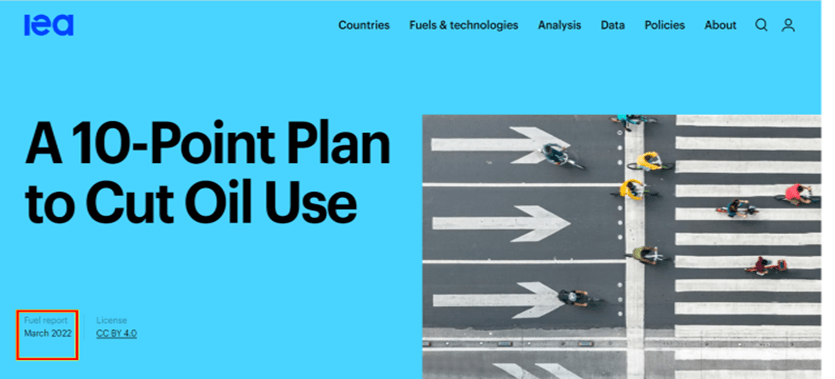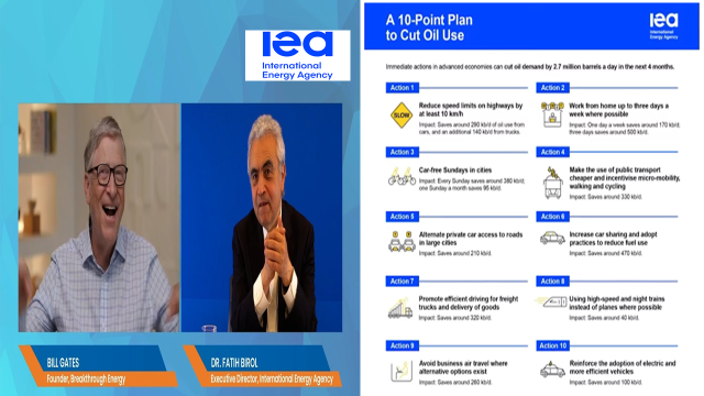 Aquí, la Agencia Internacional de Energía pública estas 10 medidas, que aparentemente son muy inofensivas, hablan de bajar la velocidad de todos los vehículos a sólo 10 km. por hora en las carreteras, trabajar desde casa hasta tres días a la semana, no utilizar carros los fines de semana, especialmente el domingo tratar de moverse a muy cortas distancias. Evitar las distancias largas, caminar y usar bicicleta, usar transportes y refrigeración de forma efectiva; pero también habla de que urge compartir los autos, de que se debe alternar el uso del carro privado con otros medios, usar trenes en lugar de aviones, evitar los viajes de negocio y, por último, acelerar el uso de los vehículos eléctricos.