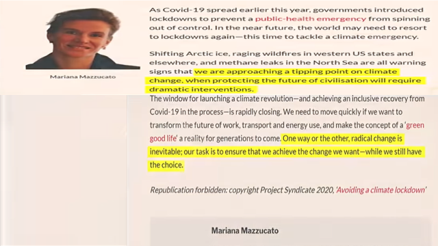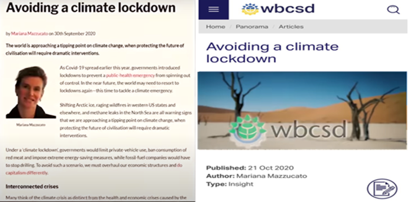Veamos el informe titulado “Evitando una cuarentena climática”, escrito por Mariana Mazzucato, una profesora de economía en el University College de Londres y directora de algo llamado el Consejo Sobre la Economía de la Salud, que es una división de la Organización Mundial de la Salud. Fue publicado en octubre del 2020 por “Syndicate”, una organización sin fines de lucro financiada por la “Open Society Fundations” entre otros.