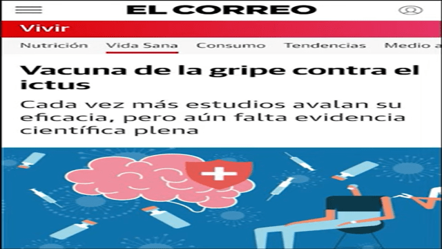 Vean esta imagen; fíjense lo que pone este medio desinformativo: la vacuna de la gripe contra el ictus (muertes repentinas) cada vez más estudios avalan su eficacia, pero aún falta evidencia científica plena; es decir que, ahora parece ser que esta inoculación contra la gripe covidiana, ha sido también probada en algunos casos eficazmente contra los ictus, que ya saben que se están dando por mayoreo, principalmente en España; y se está manifestando masivamente últimamente, debe ser por el cambio climático en gran medida.