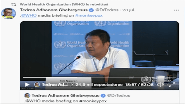 Cambiando de partitura (viruela por virus) pero con la misma orquesta, el 23 de julio pasado, el director de mama OMS el señor Tedros Adhanuevordenmundial, decidió él solo, tomó él la decisión (porque hay que destacar aquí un punto: de la votación para tomar esta decisión, la mayoría de los expertos (9) votaron en contra y sólo 6 a favor; por lo que él se tomó el derecho que le ha otorgado la organización para decidir por él mismo el hecho de declarar la situación del cuento de la viruela del mono como una emergencia internacional.