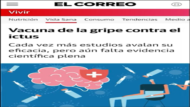 Vean esta imagen; fíjense lo que pone este medio desinformativo: la vacuna de la gripe contra el ictus (muertes repentinas) cada vez más estudios avalan su eficacia, pero aún falta evidencia científica plena; es decir que, ahora parece ser que esta inoculación contra la gripe covidiana, ha sido también probada en algunos casos eficazmente contra los ictus, que ya saben que se están dando por mayoreo, principalmente en España; y se está manifestando masivamente últimamente, debe ser por el cambio climático en gran medida.