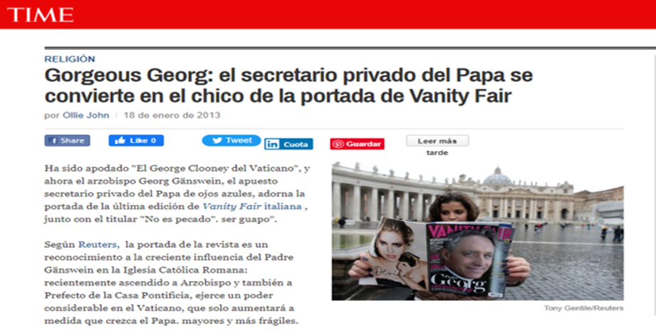 Un funcionario del Vaticano le dijo al Daily Telegraph que el perfil de Vanity Fair de seis páginas no tenía la bendición de la Santa Sede. “Habiendo dicho eso”, continuó el funcionario, “estamos bastante relajados al respecto; este tipo de cosas han estado sucediendo durante los últimos siete años. No creo que lo distraiga de su papel. Pero la vida podría ser un poco más fácil si no fuera tan guapo”.