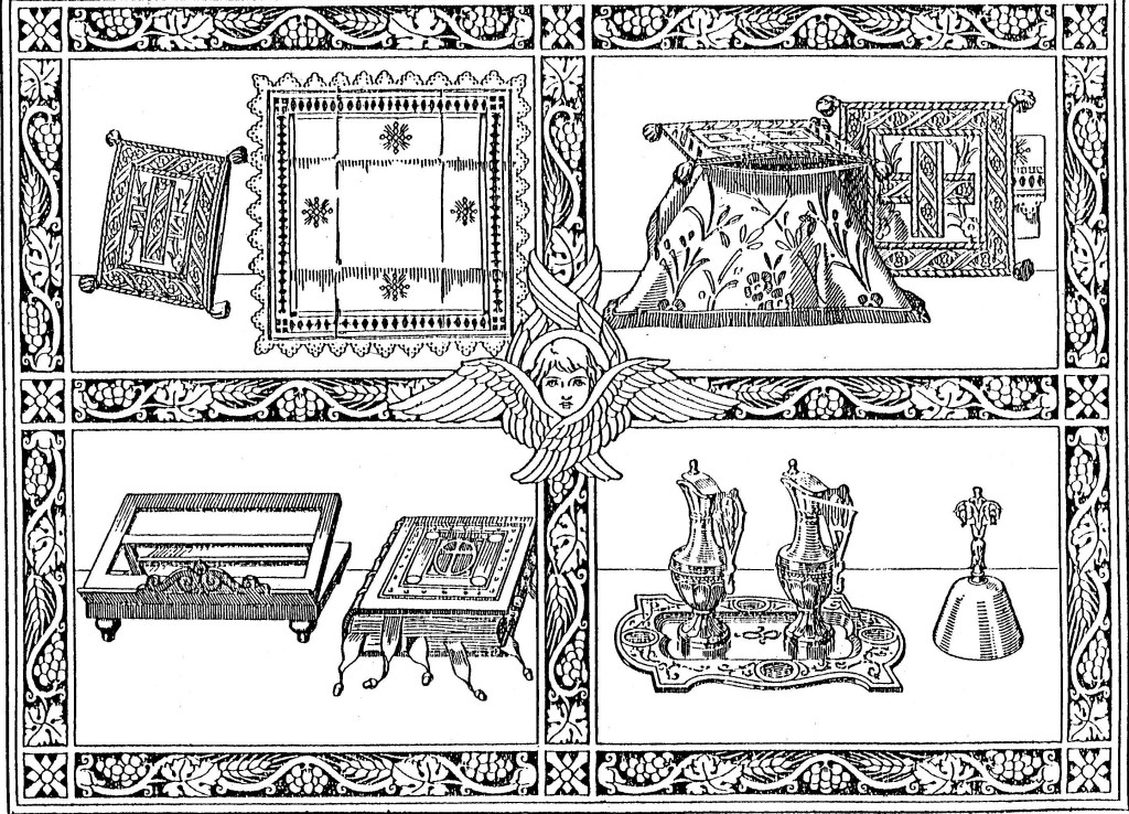 El ajuar del alar del Sacrificio lo componen: tres manteles o sabanillas de hilo, un crucifijo, y dos, cuatro o seis candeleros para otras tantas velas. Mientras se celebra la Misa, el altar se completa con tres sacras o cuadritos con algunos textos de la Misa. Cada altar suele tener una estatua o cuadro, por lo menos correspondiente a su Titular, los floreros y demás adornos son accesorios.