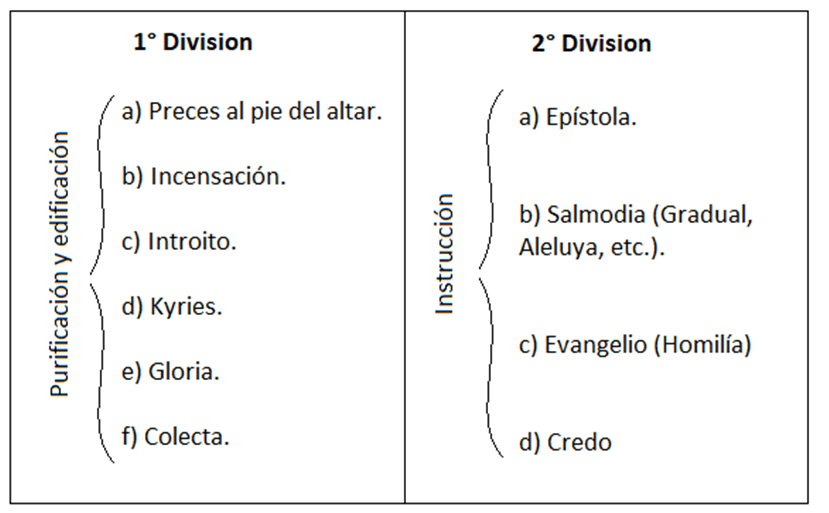 Considerando la estructura de la Misa, esta consta de dos partes: una llamada Misa de los Catecúmenos o “Ante-misa”, que abarca desde el principio hasta el Ofertorio exclusive; y otra llamada Misa de los Fieles, que comprende desde el Ofertorio hasta el fin.