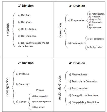 Descomponiendo las dos partes principales de la Misa en otras secundarias, se puede formar el siguiente cuadro: en el que llamamos a la primera Parte instructiva, porque efectivamente tiene ese carácter instructivo, como destinada que estaba antiguamente a la instrucción de los catecúmenos, y a la segunda Parte Sacrificial, porque en ella se realiza propiamente el Sacrificio eucarístico.