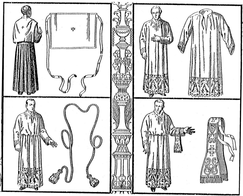 El amito, el alba, y generalmente, también el cíngulo son blancos; las demás prendas sacerdotales son de color blanco, rojo, verde, morado o negro, según las fiestas y épocas litúrgicas.
