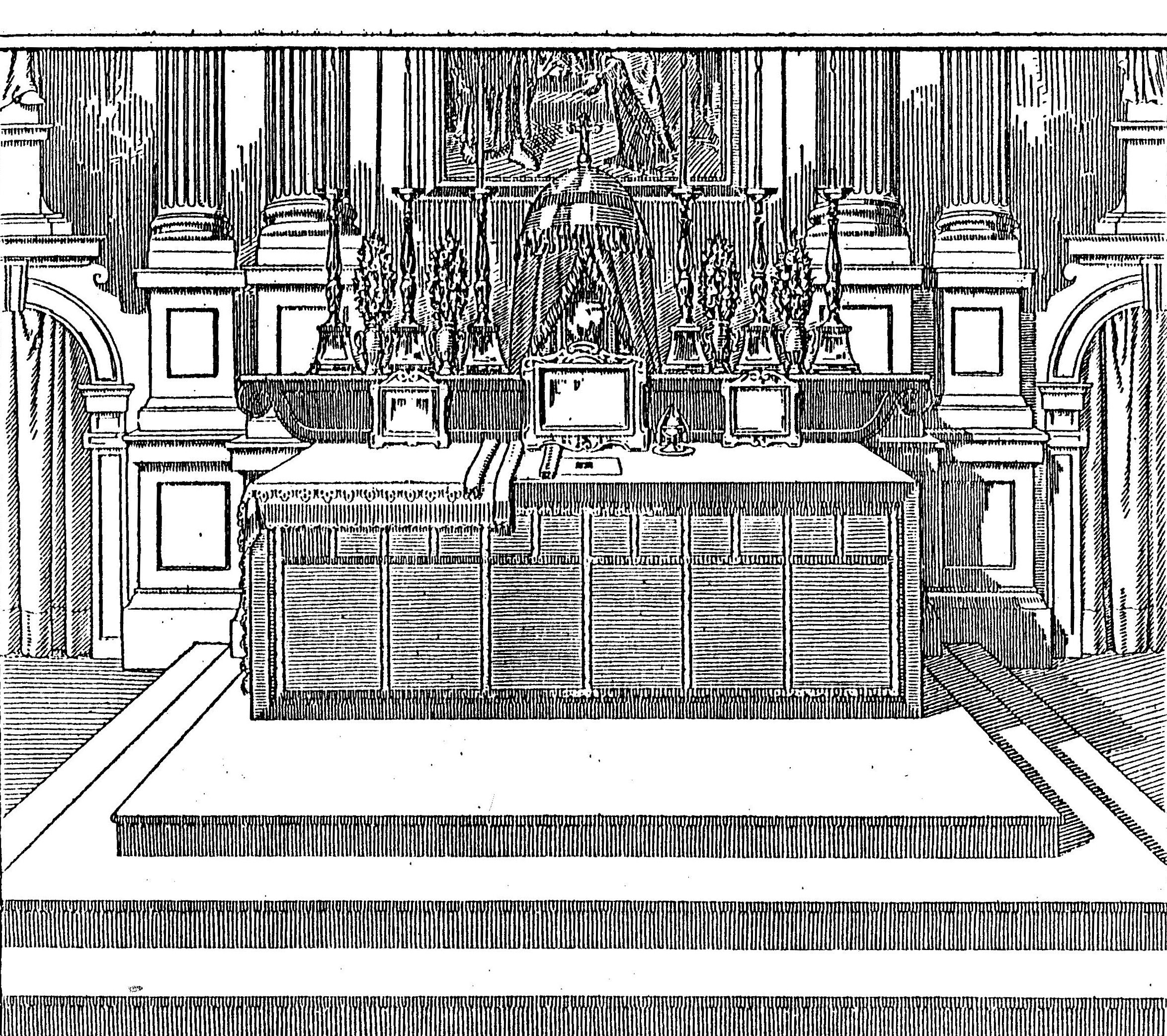 El ajuar del alar del Sacrificio lo componen: tres manteles o sabanillas de hilo, un crucifijo, y dos, cuatro o seis candeleros para otras tantas velas. Mientras se celebra la Misa, el altar se completa con tres sacras o cuadritos con algunos textos de la Misa. Cada altar suele tener una estatua o cuadro, por lo menos correspondiente a su Titular, los floreros y demás adornos son accesorios.