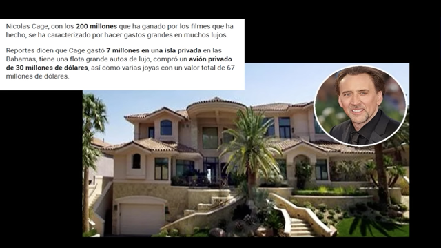 ¿Quién no conoce al actor Nicolas Cage? Bueno es un actor de los preferidos de la judeomasonería hollywoodense; él ha ganado, según la revista Forbes, por todas sus películas alrededor de 250 millones de dólares; varios reportes indican que Cage gastó 7 millones en una isla privada en las Bahamas; actualmente tiene una flota grandísima de autos de lujo y compró dos aviones privados de 30 millones de dólares cada uno, así como varias joyas por un valor total de 67 millones de dólares. Este hombre que ha gastado tanto, pero tanto, tanto, en todas estas cositas, que para él no son más que juguetitos.