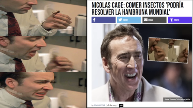 En una reciente entrevista Nicolas Cage dijo: “Creo que la humanidad tiene que hacer algo de inmediato para salvarnos, lo primero que creo es que podríamos dejar de lado la fobia a comer insectos, cucarachas o lo que sea porque, si comer esto, con hacer este simple gesto, podemos resolver el hambre mundial entonces, adelante, excelentes nutrientes están por todas partes, alta proteína nada de grasa y son lo mejor para salvar al mundo de la hambruna”.