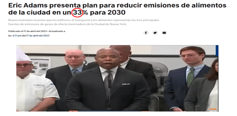 Publicaron este pasado lunes 17 de abril el primer inventario integrado de gases de efecto invernadero de la ciudad que incorpora las emisiones de la producción y el consumo de alimentos, estas emisiones representan el 20% de las emisiones totales de la ciudad de Nueva York la tercera fuente más grande detrás de los edificios que es un 33% y el transporte un 22%. (La triada perfecta de la masonería 11/22/33, 33-22=11 y del Skull and Bones 322)