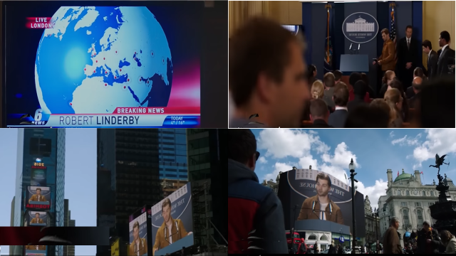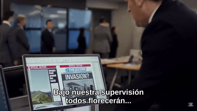 Escena de la serie “El fin de la infancia” donde las noticias muestran que habrá una invasión extraterrestre, bajo cuya supervisión todo florecerá