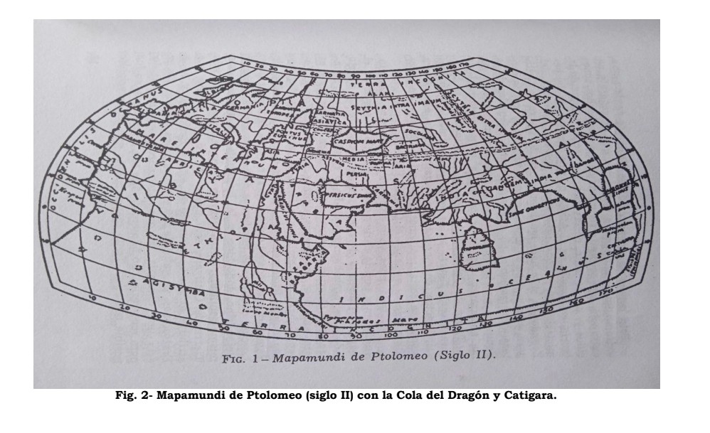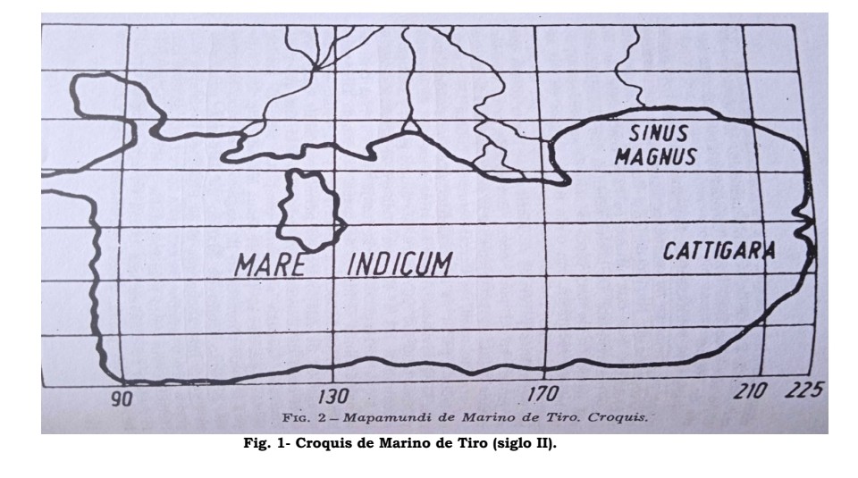 se extendía hasta las islas Marquesas. Lo cual aún era insuficiente, puesto que no podía tratarse sino del Océano Pacífico. La toponimia que nos ha dejado Ptolomeo de la Tierra de Cattigara, nos muestra que los hindúes y los chinos la frecuentaban. Más todavía, nuestro geógrafo nos relata, según Marino, el viaje que, en el siglo I de nuestra era, llevó allá al capitán griego Alejandro. Lo que asiáticos y europeos iban a buscar en el Perú que era el oro de que rebosaba el país”. (El Imperio Vikingo de Tiahuanacu, ed. Casa de Tharsis, Cochabamba Bolivia 2013, p. 36).