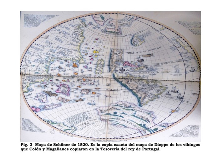El mapa de Dieppe de los vikingos archivado en la Tesorería del Rey de Portugal y que Colón descubrió y copió, es copia exacta del mapa de Schöner, como afirma Jacques de Mahieu. Es una prueba de la convicción de Colón para realizar el viaje, pues lo único que faltaba era probarlo ante el mundo entero con su descubrimiento: “En todo caso, es un hecho que el mapa de Dieppe, ahora inútil, puesto que las minas de plata de América del Sur han sido abandonadas por los vikingos, se encuentra en el siglo XV en el Tesoro del rey, en Lisboa. Colón copia sus datos y se sirve de ellos para obtener de Isabel de Castilla la autorización de ir a ‘descubrir’ una tierra que hace pasar por el reino del Gran Kan, cuando sabe muy bien que se trata de un continente que todo el mundo visita desde hace siglos. Unos años más tarde, Magallanes roba a su vez el secreto y lo utiliza para convencer a Carlos V de que le permita ‘descubrir’ el paso del Sur, que los vikingos conocían perfectamente y que figura ya en el globo construido en 1515 por Johannes Schônner, copia exacta del mapa de Dieppe, probablemente entregado por el rey de Francia y que el duque de Lorena ha hecho publicar ocho años antes, sin el estrecho”. (Colón llegó después, ed. Martínez Roca, Barcelona 1988, p. 162).