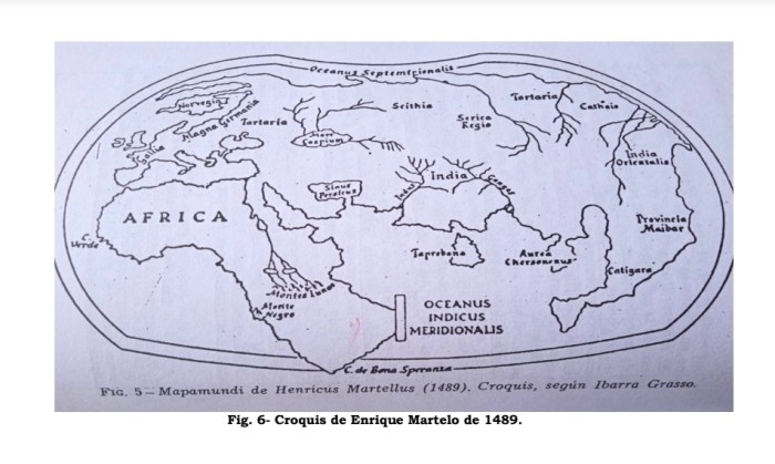 “Por el contrario, no hay ninguna duda en lo que atañe al mapa diseñado, en 1489, por Henricus Martellus: en él, la Tierra de Cattigara se convierte en una enorme península cuya forma general mucho se acerca a la de Sudamérica, Tierra del Fuego incluida. Pero alguien se había adelantado al geógrafo alemán: en el archivo secreto de Lisboa, Colón no se había limitado a copiar la carta de Toscanelli. Había visto el mapa de Dieppe, o tal vez algún mapamundi diseñado por Martin Behaim sobre la base del mapa en cuestión. De ahí su viaje a Thule, destinado a confirmar los datos así recogidos. De ahí también su certeza de que el Nuevo Mundo se confundía con la Tierra de Cattigara y estaba situado donde se encuentra realmente. Es asimismo en la Tesouraria de Lisboa que Magallanes, unos años más tarde, hurta el mapa, atribuido por Pigafetta a Behaim, en el cual figura el estrecho meridional de América”. (Ibídem, p. 173).