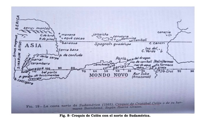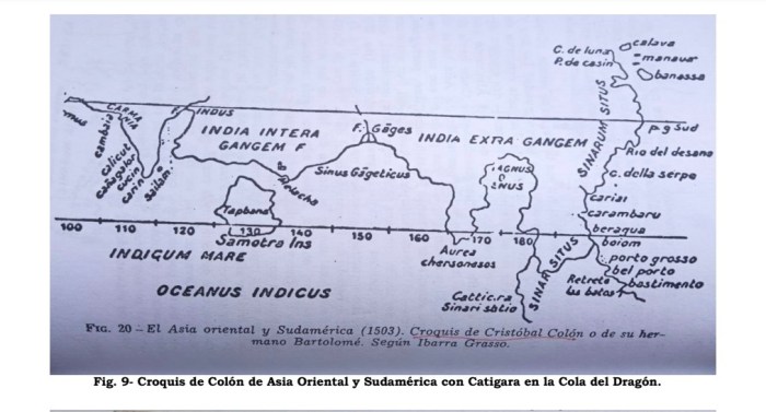 Colón conocía lo de Catigara, de la que Marino de Tiro y Ptolomeo hablaban en sus mapas. Los 2 croquis que Colón utilizó para su viaje muestran el conocimiento que tenía de las tierras nuevas que por él fueron descubiertas y dadas a conocer.