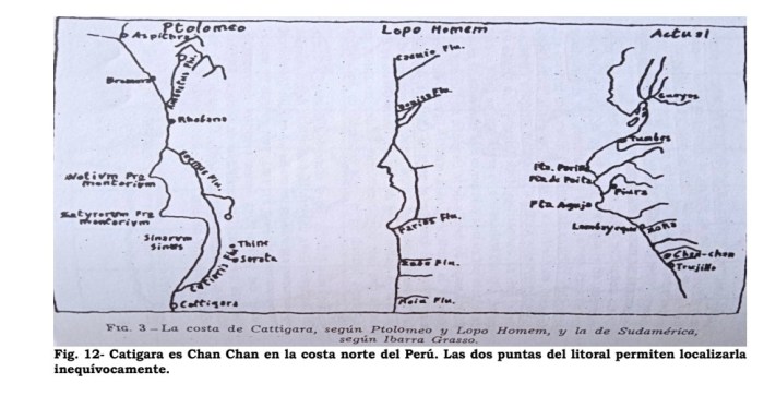 Catigara es Chan Chan en la costa del Perú, tal como loafirma Jacques de Mahieu: “No nos sorprendamos: Chan-Chan no es otra que la ‘ciudad bien conocida de Cattigara’ que menciona Ptolomeo y que sitúa en la costa este de un Sinus Magnus que separa el Quersoneso de Oro -Indochina y Malasia- de una enorme península -inexistente- que prolonga hacia el sur el Asia oriental. Un Sinus Magnus arbitrariamente reducido que, según su predecesor Marino de Tiro,