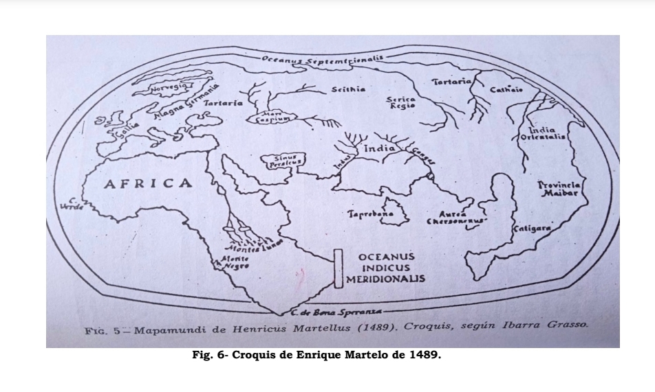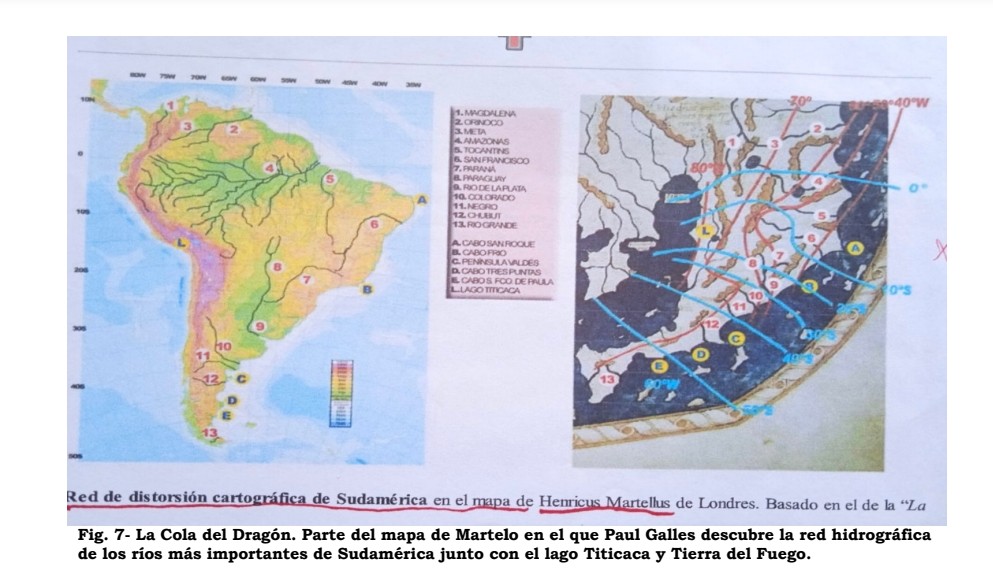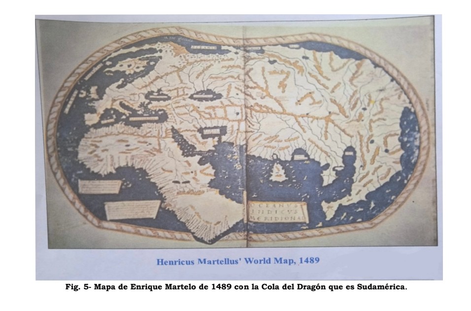 El mapa de Enrique Martelo, 1489 (Henricus Martellus, nombre latinizado de Heinrich Hammer) trae el contorno de América del Sur con la red fluvial de los ríos más importantes: rio Magdalena, río Orinoco, río Amazonas, río Paraná, rio Uruguay, Río de la Plata, río Colorado, río Negro, río Grande; y los cabos más relevantes: San Roque, cabo Frío (en Brasil), Península de Valdés, cabo Tres Puntos cabo Francisco de Paula (en la Argentina) y hasta el lago Titicaca (Perú-Bolivia), sin olvidar Tierra del Fuego por si fuera poco; tal como Paul Galles expone en su obra La Cola del Dragón (de China) pues América del Sur estaba adosada a China como una prolongación. El Pacífico que conocemos hoy, era denominado el Sinus Magnus, Golfo (cavidad) Grande, o Sinarum Sinus (Golfo de los Chinos), y sobre su origen dice Jacques de Mahieu: “En el mapa de Ptolomeo, al sur del Satyrorum Promontorium, se abre un golfo que, en realidad, no existe y que el geógrafo -o su traductor- llama Sinarum Sinus, Golfo de los Chinos. A la misma altura, pero en el interior de las tierras, figura una ciudad (‘metrópoli’, dice Ptolomeo) que lleva el nombre de Thinae. A menudo se dijo que se trataba de la capital de China, no sin agregar que su nombre provenía de la dinastía Tzin. Se llegó hasta a sostener que Ptolomeo se había equivocado lisa y llanamente, orientando hacia el sur, en lugar del norte, la costa china, lo cual constituye un doble disparate: nunca hubo la menor dificultad para medir la latitud, y la toponimia hindú excluye toda confusión. Por otro lado, el nombre de Thinae -a veces Thina o Cina-, aplicado a una ciudad de China o al país todo, era conocido en el Occidente (Eratóstenes) y en el Oriente (Kantilya, 300 a. J. C.) mucho antes de la época de la dinastía Tzin (225 a 206. a. J. C.). La hipótesis más probable, e Ibarra Grasso la insinúa, es que Thinae o Sinae (los chinos, en latín) venga de Sinus y signifique ‘los habitantes del Golfo’. Thina y sus variantes Cina y Sina serían entonces ‘el país de los habitantes del Golfo’”. (La Geografía Secreta de América antes de Colón, p. 20-21).