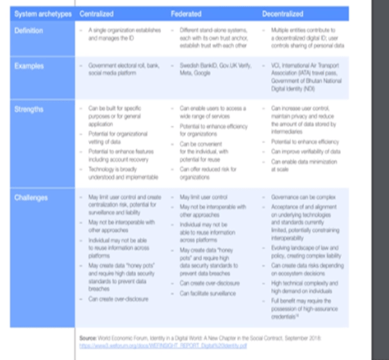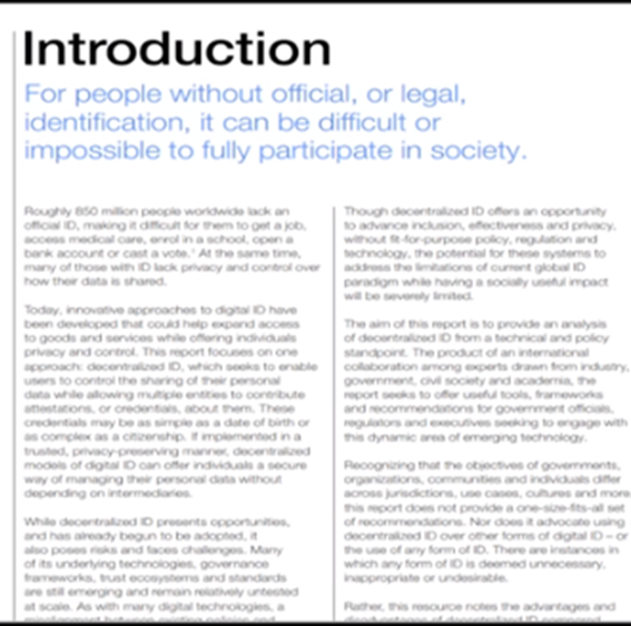 Aquí hay algo que también no me cuadra, lo quieren, pero no lo quieren, en un intento por minimizar el peligro de que una identificación digital se convierta en la base de un estado totalitario; el foro, sin embargo, promueve la idea de tener identificaciones digitales descentralizadas donde los usuarios tendrían el poder de decidir con quién compartir sus datos y la información del usuario.