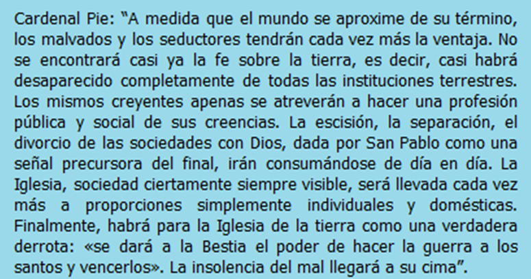Cuando viereis que la abominación de la desolación, que fue dicha por el profeta Daniel, está en el lugar santo, el que lee entienda. Entonces los que estén en la Judea, huyan a los montes. Y el que en el tejado, no descienda a tomar alguna cosa de su casa. Y el que en el campo, no vuelva a tomar su túnica. ¡Mas ay de las preñadas y de las que crían en aquellos días! Rogad, pues, que vuestra huida no suceda en invierno o en sábado. Porque habrá entonces grande tribulación, cual no fue desde el principio del mundo hasta ahora ni será. Y si no fuesen abreviados aquellos días, ninguna carne sería salva; mas por los escogidos aquellos días serían abreviados.