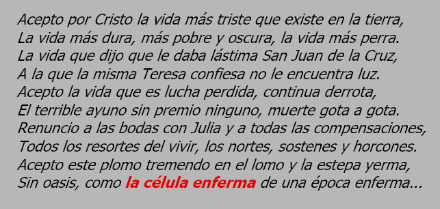 «Señor, yo te ofrezco mis días perdidos hasta hoy – Los libros que hubiera podido escribir – Mi bien por hacer, la inmensa carencia que soy – Y mi única actual posibilidad, sufrir…»