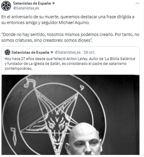 La asociación de satanistas de España recordó el 27° aniversario de la muerte de Antón Lavey, precisamente en las fechas en las que arreciaban las inundaciones en Valencia. El número 27 es recordado por la edad de muchos cantantes de música degenerada que se suicidaron víctimas de sus excesos con las drogas, etc.